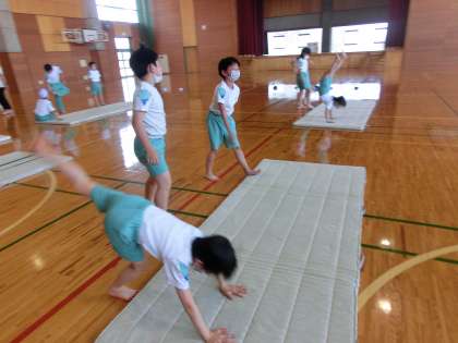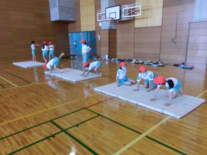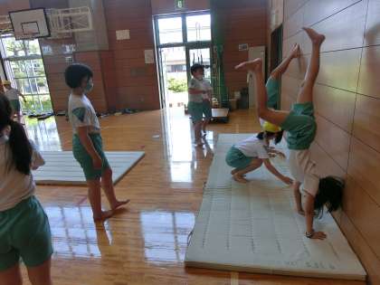 4年生ではマット運動に取り組んでいます。今日は側方倒立回転と壁倒立、倒立前転にチャレンジしました。クロムブックで自分の技を確認したり、友達からアドバイスをもらったりして自分の技を磨いていました。できる技が増えてきて子供たちはうれしそうな様子でした。