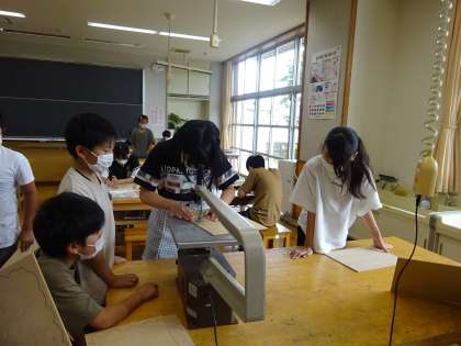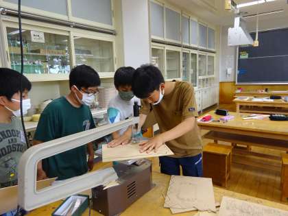図画工作科では、糸のこぎりを使って切り、自分だけの伝言板を作っています。初めての糸のこぎりに子供たちには緊張しながらも、線に沿ってゆっくり板を動かしていました。「大丈夫?」「いいね!その調子!」などと、友達と声を掛け合いながら、安全に使うことができました。完成が楽しみです。