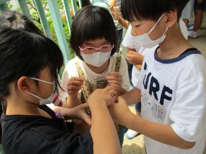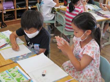 理科の学習では、待ちに待ったモンシロチョウの幼虫が成虫になりました。今日は、成虫のからだの秘密をみんなで見付けました。中には、うっすらと羽が見えるさなぎもあり、「こんなに小さいさなぎのからだの中に、チョウが入っているんだね。きっとくるしいよね。」とつぶやく子供もいました。チョウの立場に立って考えることのできる、やさしい3年松組の子供たちです。最後は、みんなでお別れ会をして、見送りました。