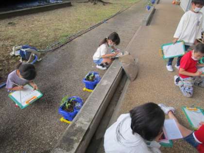 生活科の学習では、芽を観察し、気付いたことを紹介し合いました。目で見るだけでなく、触ったり、においをかいだり、音を聞いてみたりしました。じっくりと観察することで、葉っぱの模様や毛、茎の赤色等、様々なことに気付き、さらにあさがおのことが好きになったようです。