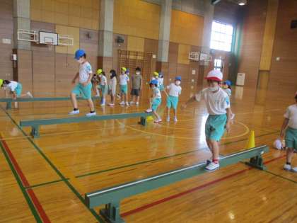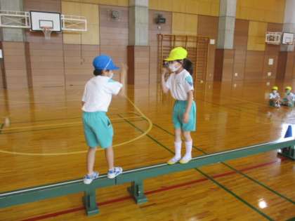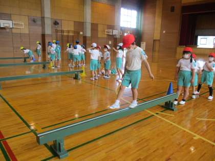 体育の学習では、平均台を使って平均台遊びをしました。落ちないようにそっと歩いたり、横向きに挑戦したりといろいろな歩き方を考えました。ショートコースで慣れてきたら、次は平均台を2台つなげたロングコースに挑戦しました。最後には、団別じゃんけん大会を行いました。