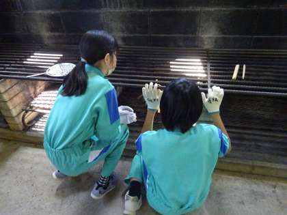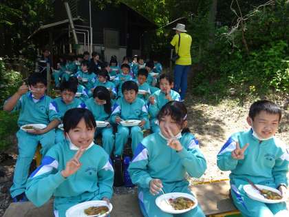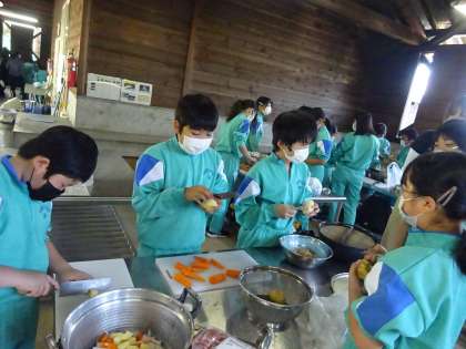 1日目の活動として、午前中は野外炊飯を行いました。おいしいカレーライスを作るために、班のみんなと力を合わせて作りました。野菜を切っているときには、「私、切るからこっちの仕事お願い!」かまどに火を付けるときには、「かまどの火の加減バッチリだね!」と友達と声を掛け合い、助け合いながらスムーズに調理を進めていました。どの班もみんなで作ったカレーライスを食べて、「おいしい!」と思わず笑みがこぼれていました。最高においしいカレーライスができましたね!