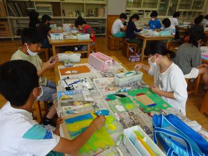 図画工作科では、伝言板を製作中です。糸のこぎりで切った板に色を付け、自分らしさあふれる作品になりそうです。色を塗るときにムラがあまり出ないように、塗り方に気を付けながら、塗り進めました。完成が楽しみですね!