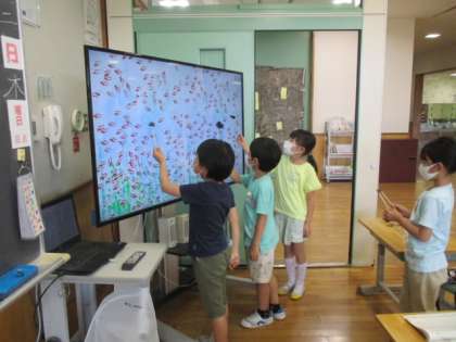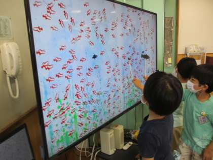 国語科「スイミー」の学習が始まりました。昨日作ったスイミーと赤い魚のペープサートを使って、水中を泳ぐ様子を表しました。1場面から読み取ったスイミーの様子を表しながら、音読することができました。