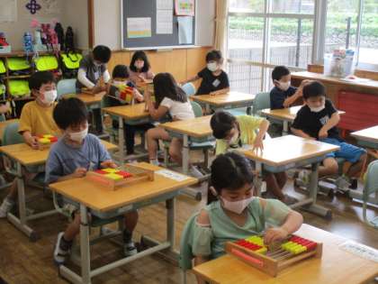 初めて100玉そろばんを使って学習しました。これから算数の学習で活用します。今日は、そろばんを使って1から10まで唱えたり、10はいくつといくつか確かめたりしました。また、話を聞くときや使わないときには、机のよこにかけておく練習もしました。すばやく行動することができました。