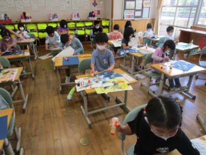 前の図工の学習でいろいろな場所やものののこすり出しをしました。今回は、こすり出した模様を使って、好きな形に切り取る活動をしました。丸、三角、四角、星、また、生き物の形等、様々な形に切り取るのを楽しんでいました。
