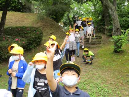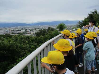 まず始めは、呉羽山展望台。呉羽山からは、立山連邦や富山市の様子がよく見えました。子供たちは、「高い建物がたくさんあるね」「ファボーレも見えるよ」と発見したことを口々に話していました。