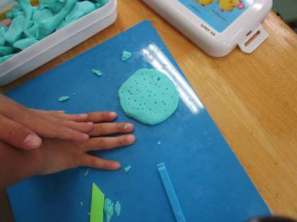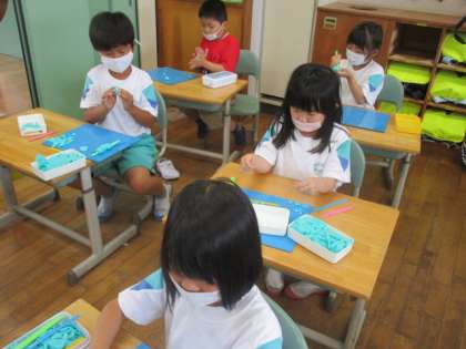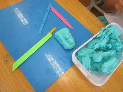 図工では、粘土を使って、ごちそうづくりをしました。ピザやパン、おにぎり、ケーキ等、おいしそうなごちそうを次々に作っていました。