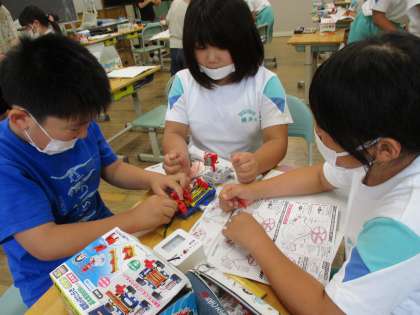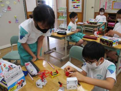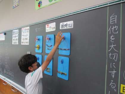 理科の学習で「直列つなぎ」と「並列つなぎ」のつなぎ方の違いや、それによってモーターの動きが変わるのかを実験キットを使って調べました。モーターの回転速度や豆電球の明るさの違いを目の当たりにして、「直列つなぎ、強い!」など思ったことを素直に表現しながら実験を進めていました。
