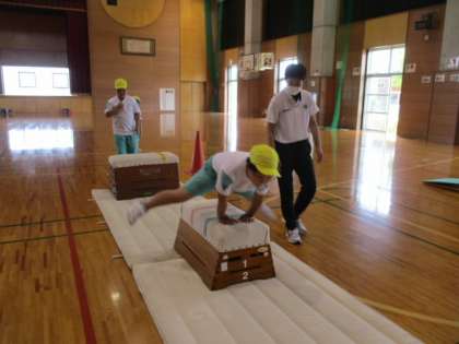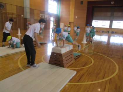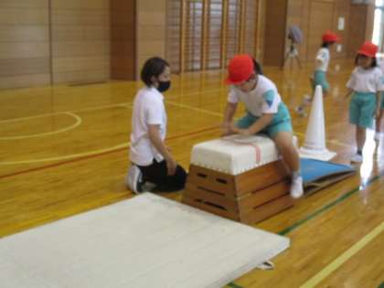 スポーツ指導員の方に跳び箱遊びの指導をしていただきました。4つのコースを色団ごとに周り、様々な跳び箱の跳び方にチャレンジしました。最初は苦手だと話していた子供もできるようになったと喜んで話してくれました。