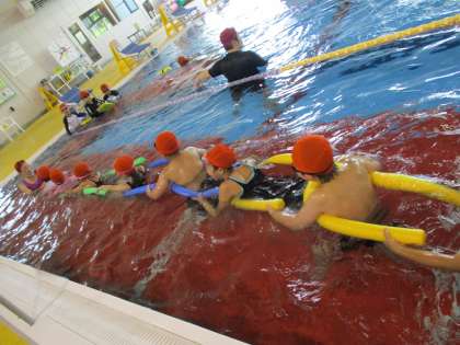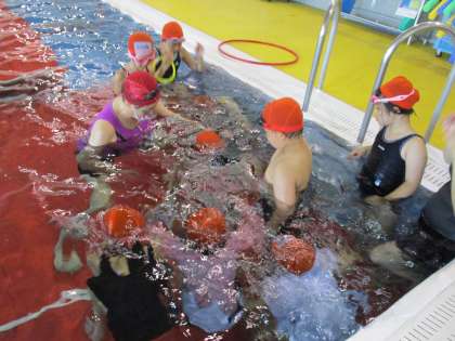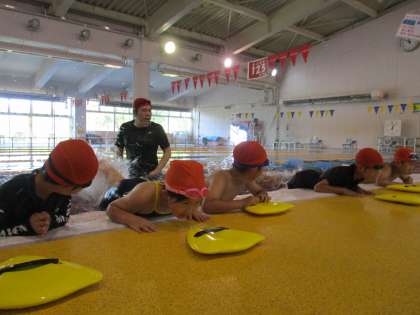今日は、B&G海洋センタープールでの水泳教室2日目でした。2回目ともなると、場所にもコーチにも慣れ、笑顔で練習がスタート。バタ足の練習からスタートするグループや、顔を付けてもぐりリングをとる練習をするグループなど、どの子も自分の目当てに向けて楽しく取り組んでいました。