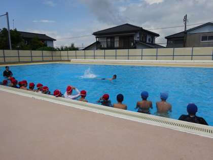 今日は、中学校の先生をお招きして、水泳教室を行いました。力を抜いてバタ足をする方法や、けのびのコツなど、細かい動き方まで教えていただきました。「前よりもちょっと泳げるようになった気がする!」「足を付けないで半分まで泳げたよ!」と自分の泳ぎに自信がついた様子が見られました。