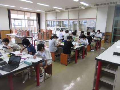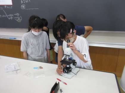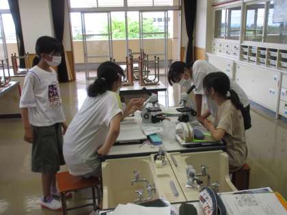 理科では、身近な動物が何を食べて生きているのかを進んで調べました。メダカは何を食べているのか疑問を持ち、メダカが住んでいる水の中に何があるのかを顕微鏡を使って調べました。ゾウリムシなどの微生物を食べているということを知ることができました。