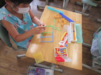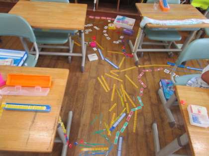 図工「ならべてならべて」の学習では、自分の算数セットのブロックやおはじき、数え棒等を自分の好きなように並べて楽しみました。自然と友達の並べたものともつながり、どんどん世界が広がっていっていました。