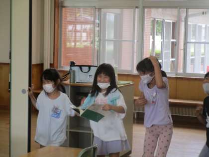 国語「おむすびころりん」では、学習のまとめとして、自分でやりたい役を決めて音読会をしました。体の動きを付けたり、おじいさんの言葉の言い方を工夫したりしていました。