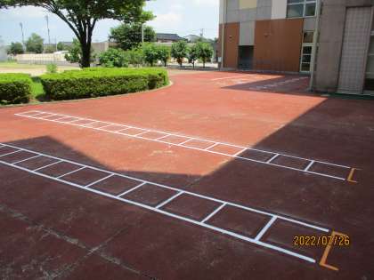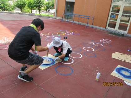 わくわく広場には、スプレーで輪をたくさん描きました。「ケンケンパー」とジャンプをして楽しめます。ラダーや一輪車も楽しめるようになります。また、体育館の用具も使いやすいように整理しました。