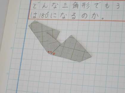 算数科では、「図形の角を調べよう」の学習を行っています。昨日、二等辺三角形の3つの角の和は180度ということが分かり、どの三角形でも3つの角の和は180度といえるのか?という疑問が出てきました。そこで、今日は、いろいろな三角形の角の和を調べてみることにしました。すると!小さい三角形でも大きい三角形でも3つの角の和が180度となることに気付くことができました。子供たちは、「こんな細いのでも180度かな?」「小さすぎたら180度にならないかも?」予想をしながら取り組む姿が見られました。