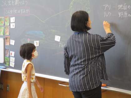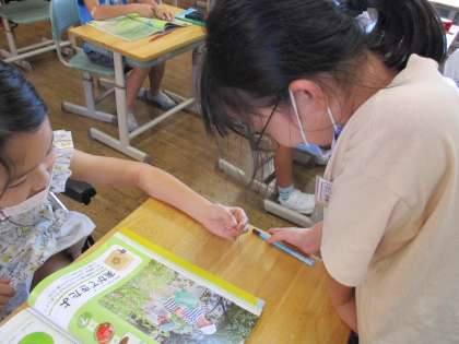 理科では、「実ができたよ」「虫のすみか」の学習を行いました。畑に植えたひまわりの種を見たり、触ったりしながら「つるつるだ〜」「柔らかいな。実が入ってないよ」と口々に感想を伝えていました。また、それぞれの発表を通して、虫はえさがあるところを住処にしていると学びました。