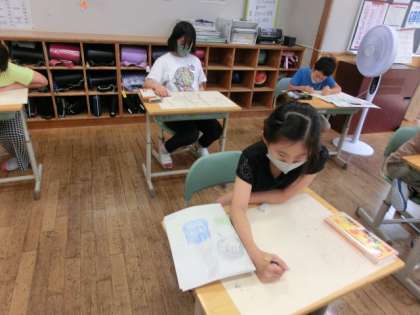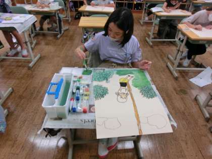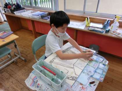 図画工作科では「わすれられない気持ち」という授業で絵の製作に取り組んでいます。宿泊学習や夏休みの思い出を絵に表している子供たちはとても楽しそうです。完成するのが楽しみですね。