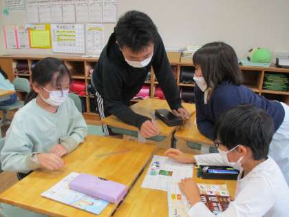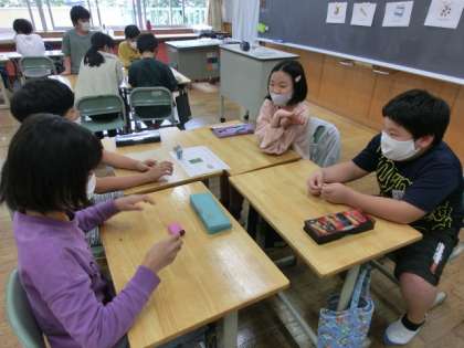 外国語では文房具の名前を英語で言ったり、「Do you have〜?」の表現を使ったりして活動しています。今回は英語のすごろくを使って友達に持っている文房具について質問しました。すごろくを通して、楽しく英語に親しんでいた子供たちでした。