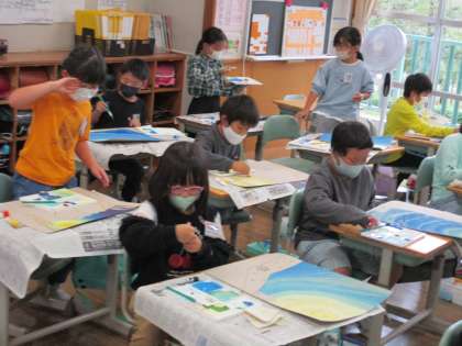 3年生の図画工作では、物語の心に残った場面を画用紙に描いています。前回取り組んだグラデーションの学習を生かして、きれいな月夜を描いています。