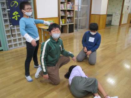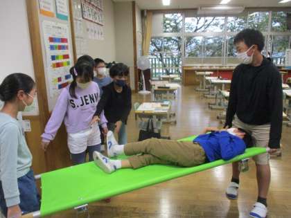 社会科の学習では、災害からくらしを守る方法について学習を進めています。今日は「自主防災隊」という組織が自分たちの命を守るためにどのような取組をしているのか調べました。安全かつ素早く行動するために役割分担していることを知り、模擬訓練をしてみました。担架の重みや現場の混乱を少しではありますが、実感できた子供たちでした。