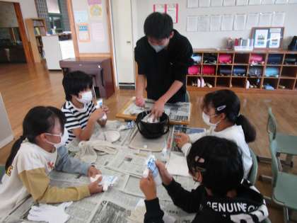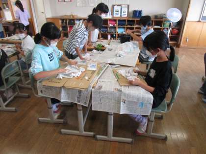 今日の図画工作科では、液体粘土でタオルや軍手を固め、どのような形になるか想像しながらタオルの形を作りました。また、思いもよらない形から、これは何に見えるか考えて今後どのように色付けしようか計画を立てていました。作品の完成が楽しみです。