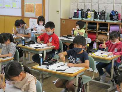 しーんと静かに静まりかえる書写の時間。今日は、「点」と「はね」に気を付けながら「小」の字を書きました。筆の流れに気を付けて、一筆一筆丁寧に取り組んでいました。