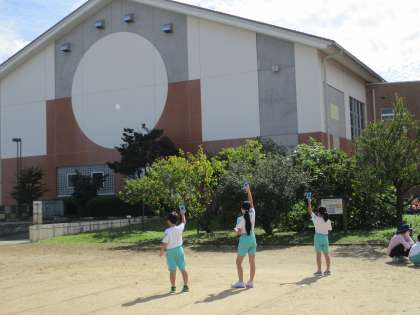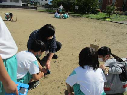 また、次の学習の理科では、太陽の光について光を集めて温度を調べました。実験の合間に、走り回る子供たちやアリーナの壁の円を見付けて、円の中心に光を集めていた子供たちがいました。理科の学習でも、算数の学習が生きている!すばらしいですね。