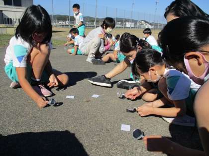 今日の理科は、「日光の光を集めよう」の学習をしました。今日はとても気持ちのよい秋晴れだったので、日光の光を集める実験日和でした。どうやって、光を小さくできるかな?と試行錯誤しながら、集中して実験をしていました。紙を焦がして字を書く子や模様を描く子など、とても楽しく学習していました。