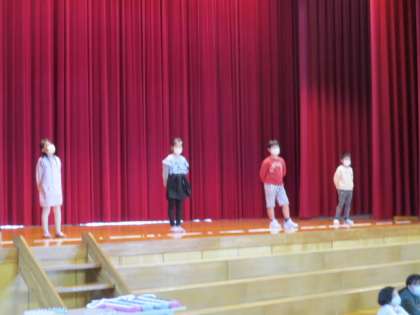 来週の本番に向けて、練習を頑張っています。立つ位置や動きの確認を行いました。大きな声でセリフを話したり身振り手振りを付けたりと自信をもって取り組めるようになってきました。