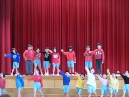 今日は1回目の本番として校内発表会を行いました。始まる前には「緊張する!」と話していましたが、いざ始まると大きな声で話したり、ダイナミックに表現運動をしたりと発表することができました。終わったあとには、「楽しかった!」や「思ったより緊張しなかった!」と話していました。5日の本番が楽しみです。