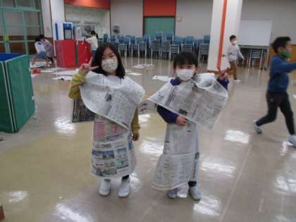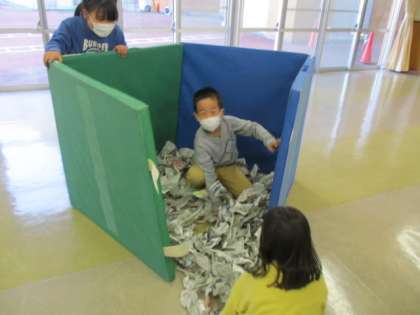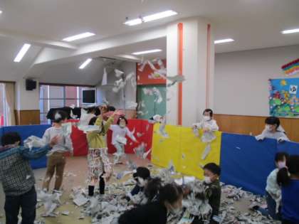 色団ごとに話し合いながら、新聞紙をつかって楽しく遊びました。「ねじねじ」「ひらひら」「びりびり」と新聞紙をねじったりちぎったりしました。ボールプールを作る団や家を作る団、衣装を作る団など様々な遊びを楽しみました。最後には一つにまとめて、大きなプールを作りました。
