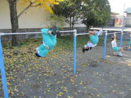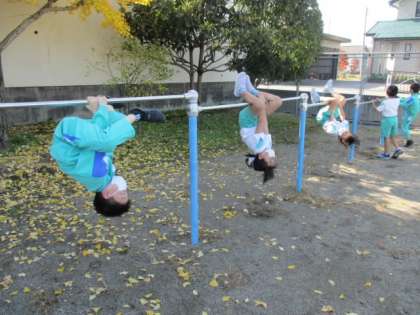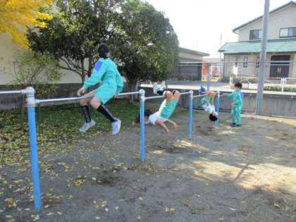 鉄棒でいろいろな技に挑戦しています。地球周りやぶらさがり、こうもりふりなど一つ一つの技ができるようにしています。最後には技をつないで発表できるようにしたいと考えています。