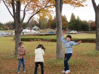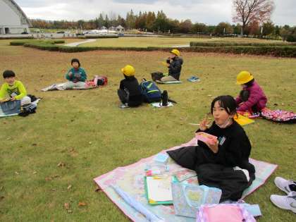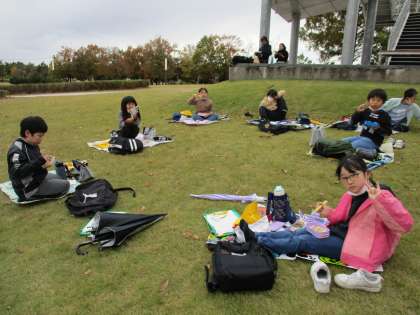 子供たちが待ちに待ったお弁当タイムは、富山県総合運動公園の広々とした芝生の上で頂きました。少し風が冷たかったのですが、子供たちは、ほっかほかの笑顔でお弁当をほおばっていました。食後は、鬼ごっこをしたり、落ち葉を集めて遊んだり・・・とても楽しかったですね。