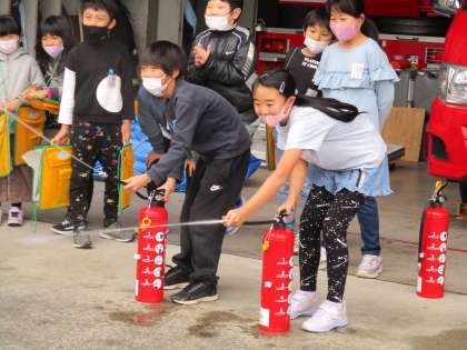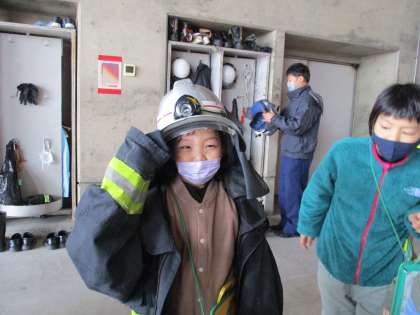 最後は、富山消防署で消火体験や消防車内の見学をさせてもらいました。実際に、酸素ボンベや防火服を身につけたり、ホース等を触らせてもらったりし、とても重いことに気付きました。また、身近にもし火事になったときのための消火栓や住宅火災警報器があると教えていただき、帰りのバスの中では、「学校までいくつ消火栓があるかを数えよう!」と言って一生懸命に数えている子供たちがいてとても微笑ましかったです。