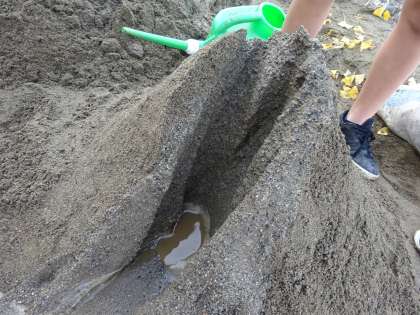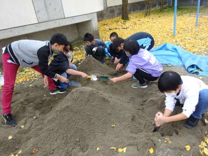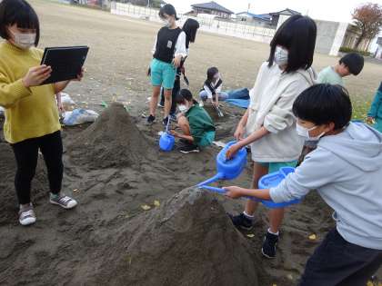 理科では、流れる水のはたらきについて学習をしています。学校の砂場を使って、山をつくり、水を川と見立てて実験を行いました。頂上から水を流すと、土がどんどんけずりとられ、下に積もっていく様子が見られました。その様子に子供たちは、「たくさん積もっていく!」「水をもっと流すと、さらに積もった!」と水のはたらきについて実験を通して理解を深めていました。