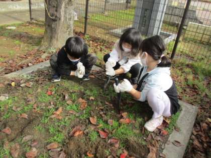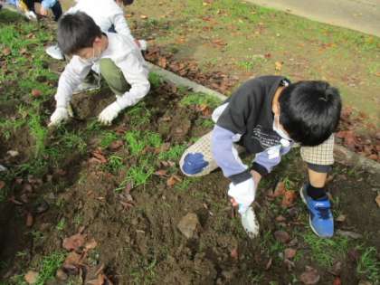 今日はチューリップの球根を植えました。土おこしや草むしりをしながら畑を耕しました。そして春に収穫した球根を植えました。きれいなチューリップが咲くように願いをこめて、力を合わせて植えました。