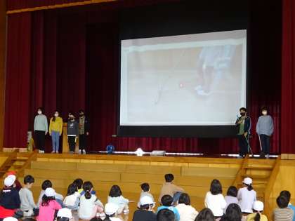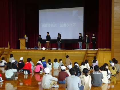 今日は、5・6年生が中心となって児童集会を開きました。各委員会から全校のみんなに伝えたいことを発表しました。どの委員会もクイズやゲームなどみんなに楽しみながら知ってほしいという思いをもって取り組んでいました。集会後、「どの委員会もよい発表だった」と振り返っており、よい機会となりました。
