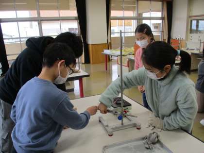 理科では、温度変化による体積の変化に続いて、物がどのようにあたたまっていくのか調べる学習をしています。今日は、サーモインクを塗った金属の棒を、端や中央など熱する場所を変えながらあたたまり方を調べました。初めて使う実験器具も多くあり、どきどきしていた子ども達でしたが、熱が伝わっていく様子をじっくり観察し分かったことをまとめることができました。