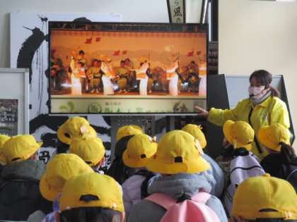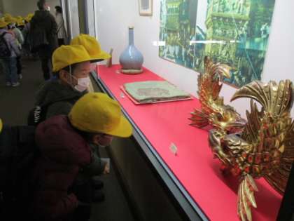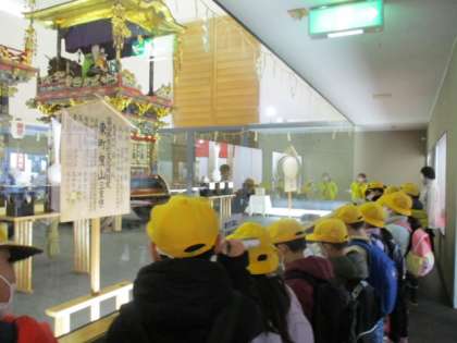 待ちに待った校外学習へ行きました。まずは曳山を見学しました。それぞれの山の彫刻や屋根の造り、鳳凰などの意味を聞きました。7mほどの高さでその大きさに驚いていました。