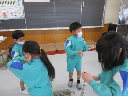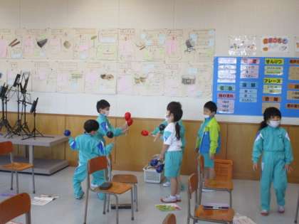 1年生は、音楽で、いろいろな楽器と触れ合い、お気に入りの音を見付ける活動をしました。マラカスやクラベス等、初めて触る楽器もあり、音を鳴らしながらノリノリで踊る子供たちもいました。