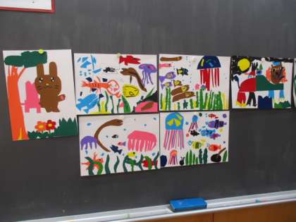 少しずつ版が仕上がってきました。11色のシールがあるので、魚やクラゲに模様をつけたり、ちぎり絵のようにして空の様子を表したりと色彩豊かな作品になってきています。