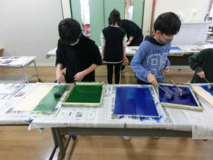図工の時間に彫り進めてきた版画の背景に色を付けました。背景がきれいな色になるように、隅々まで色を付けたり、バレンで優しく擦ったりしました。丁寧に一生懸命に刷ったのでどの作品も素敵な背景になりました。完成が楽しみですね!