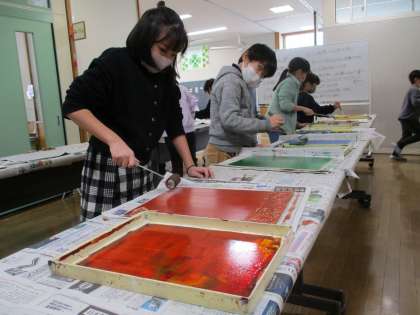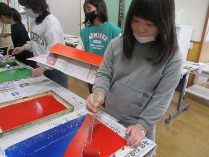 図工の時間に彫り進めてきた版画の背景に色を付けました。背景がきれいな色になるように、隅々まで色を付けたり、バレンで優しく擦ったりしました。丁寧に一生懸命に刷ったのでどの作品も素敵な背景になりました。完成が楽しみですね!