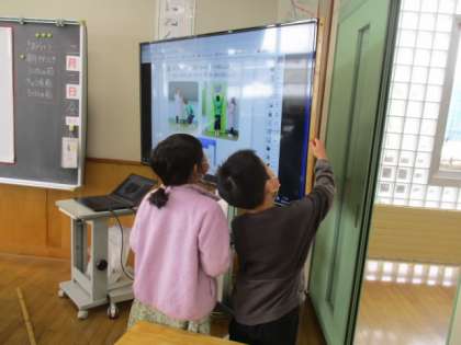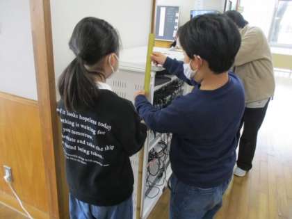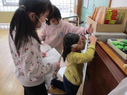 1mの長さは身の回りにどれくらいあるのか、予想をして実際に計測しました。ペアの人と協力しながら、本棚の横の長さやモニターテレビの縦の長さなどを測りました。測ってみると思っていたよりも1mのものが無かったことに驚きました。また、「家でも測ってみたい」と意欲を高めていました。