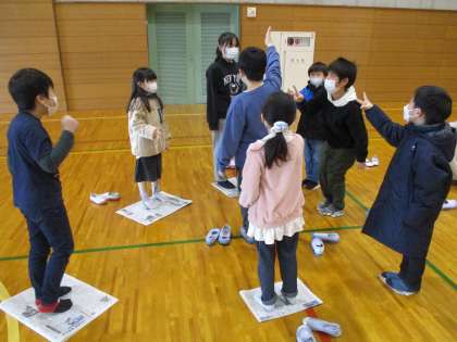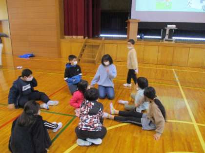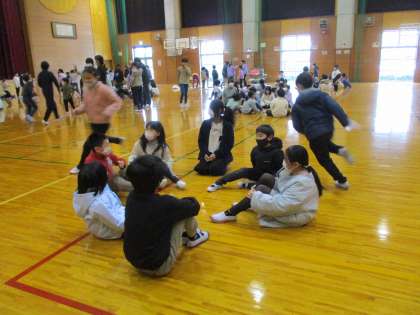 児童集会の最後に、縦割り班ごとに考えた遊びで楽しみました。6年生が中心となって、仲良く遊ぶことができ、満足そうな子供たちでした。