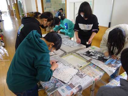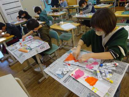 図画工作科のステンシル版画では、真っ白だった絵に色を付けました。色を付けることで絵がパッと華やかになりました。子供たちは、何を目立たせたいかを考えながら着色を行っていました。もうすぐ完成ですね!