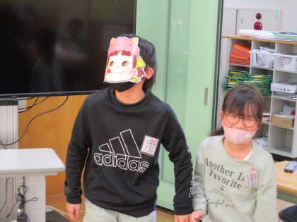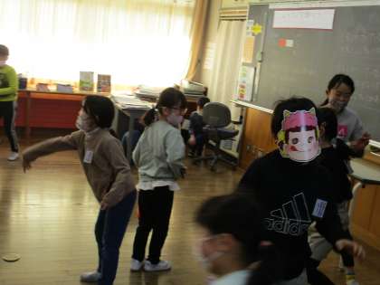係活動発信!「3松豆まき大会」が開催されました。鬼のお面を付けて、紙で作って豆に見立てて豆まきが始まりました。「鬼は〜外〜、福は〜内〜」と口々に叫びながら、紙を投げる子や逃げる子、隠れる子様々でとても楽しそうでした。きっと、福がいっぱいな1年になるでしょうね。