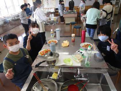 事前に自分で作る料理を決め、調理器具や食材を真剣に考えてきたのを基に、調理実習を行いました。5年生の頃から学んできた包丁の使い方や調理の仕方を思い出し、より美味しく出来上がるようにしていました。切り方や味付けを工夫する姿が見られています。